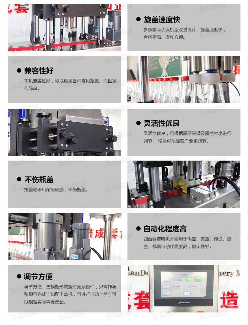 3、靈活性優(yōu)良,可根據(jù)瓶子高矮及瓶蓋大小進行調(diào)節(jié)、松緊可根據(jù)客戶要求調(diào)節(jié)。