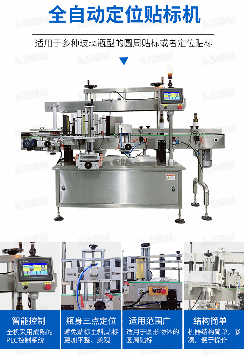 本機(jī)適用于食品、醫(yī)藥、化妝品及其它輕工行業(yè)中的扁瓶貼標(biāo)、方瓶貼標(biāo)、圓瓶貼標(biāo)之理想設(shè)備。功能操作簡單,結(jié)構(gòu)緊湊。采用光電檢測,PLC控制,觸摸式軟件操作,輸送帶、扶正帶、頂帶、卷瓶帶均為無級(jí)變頻調(diào)速,具有貼標(biāo)準(zhǔn)確、精度高等優(yōu)點(diǎn);同時(shí)具有無物不貼標(biāo),無標(biāo)自動(dòng)校正、自動(dòng)檢測等功能。本機(jī)既可單機(jī)使用,也可與其它包裝機(jī)自動(dòng)連線使用。