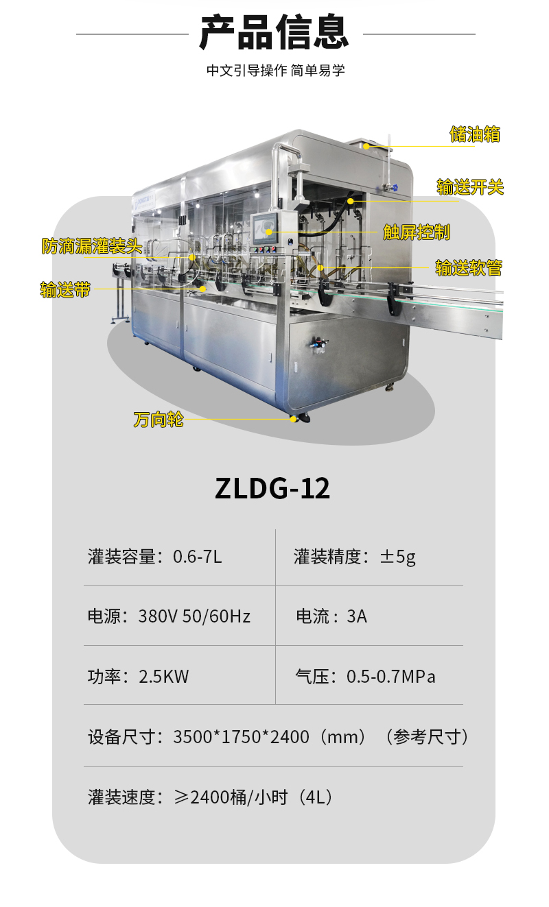 工業(yè)油潤滑油灌裝機技術(shù)參數(shù) 灌裝速度:3600瓶/小時  電源電壓 380V 5.6KW  機器外形尺寸:長*寬*高400cm*200cm