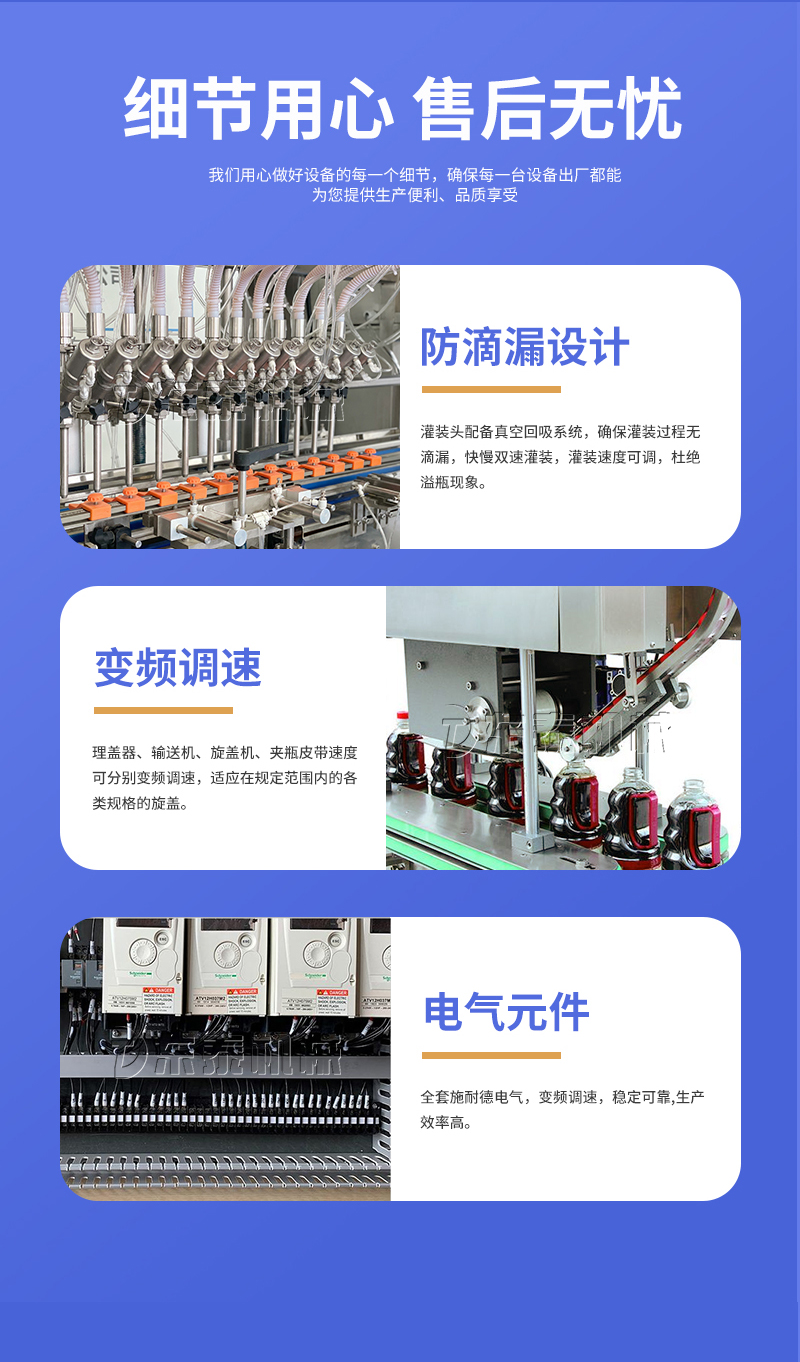 電子量杯感應(yīng)直列式灌裝機(jī),是目前國內(nèi)液體灌裝的高端產(chǎn)品,自動(dòng)化程度高,灌裝計(jì)量精確,適用于塑料瓶、玻璃瓶等各種幾何形狀的瓶型的不含氣體的酒水、飲料、調(diào)味品及其他溶液的定量灌裝。機(jī)器采用觸摸