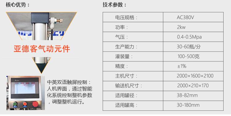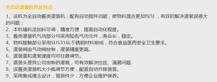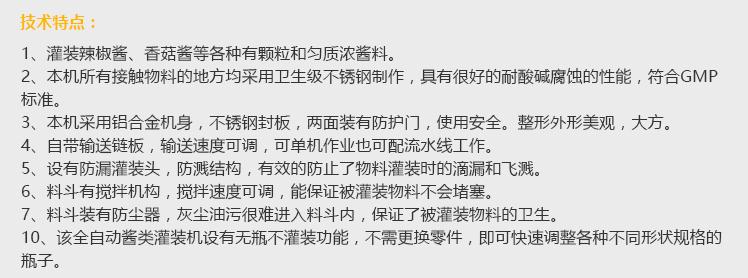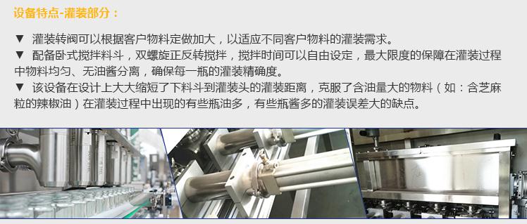 產(chǎn)品簡介 灌裝機(jī)采用活塞式灌裝原理,適用于調(diào)味品中帶顆粒并且濃度較大的辣椒醬、豆瓣醬、花生醬、香菇醬、果醬、牛油火鍋底料、紅油火鍋底料、蝦醬等較為粘稠醬類的灌裝。 產(chǎn)品優(yōu)勢(shì) 1、該機(jī)
