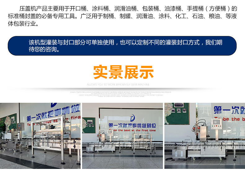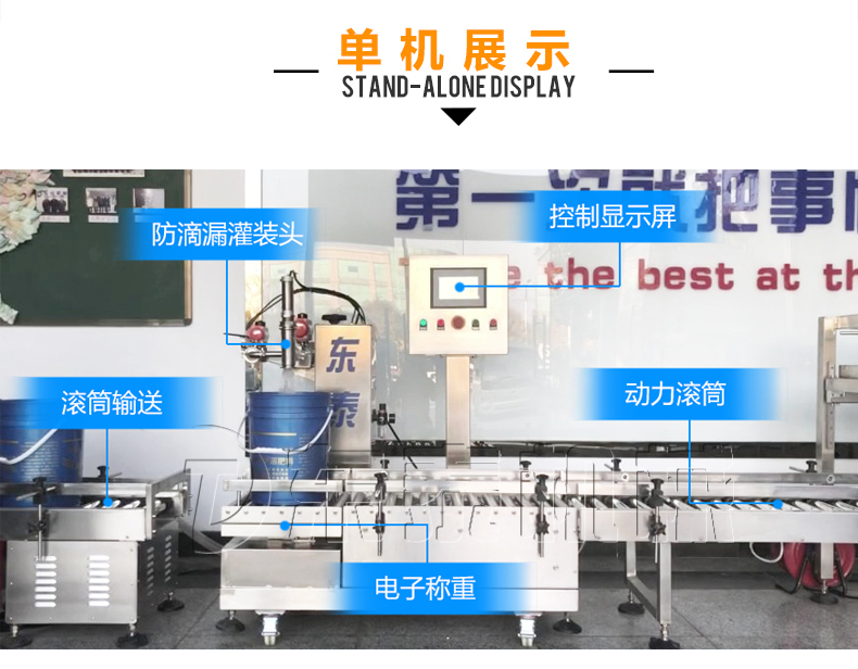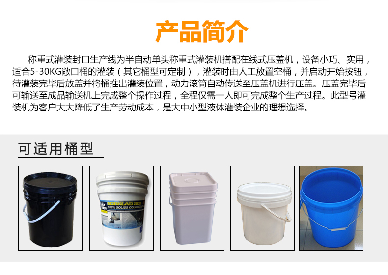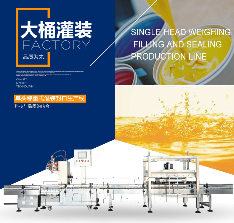 稱重式灌裝封口生產(chǎn)線為半自動單頭稱重式灌裝機(jī)搭配在線式壓蓋機(jī),設(shè)備小巧、實(shí)用適合5-30KG敞口桶的灌裝(其它桶型可定制),灌裝時(shí)由人工放置空桶,并啟動開始按鈕,待灌裝完畢后放蓋并將桶推岀灌裝位置,動力滾筒自動傳送至壓蓋杋進(jìn)行壓蓋。壓蓋完畢后可輸送至成品輸送機(jī)上完成整個(gè)操作過程,全程僅需一人即可完成整個(gè)生產(chǎn)過程。此型號灌裝機(jī)為客戶大大降低了生產(chǎn)勞動成本,是大中小型液體灌裝企業(yè)的理想選擇。
