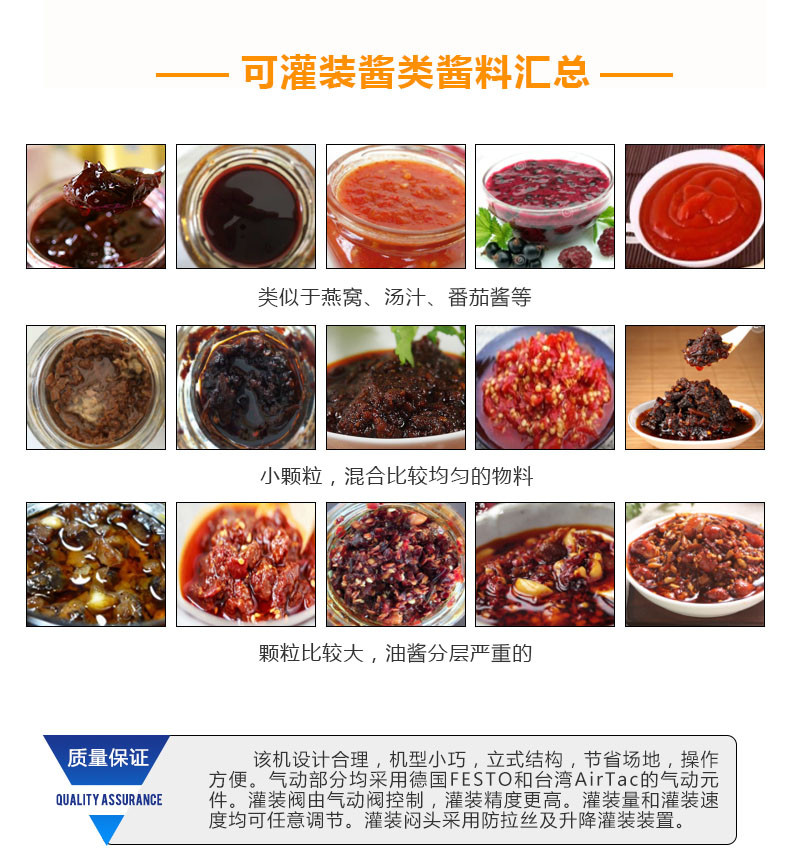 隨著機械技術(shù)的快速發(fā)展灌裝機的發(fā)展也是日新月異,使得其種類比較多。蘸醬在我國擁有悠久的歷史,在我國烹飪中占有著重要的地位,發(fā)展到現(xiàn)在在做菜和食品中也不可或缺,巨大的市場使得蘸醬灌裝機擁有巨大的市場,醬類廠家在引進設(shè)備時都想采購到高效率、適合自己的蘸醬灌裝機械。人們對食品要求的提高使得醬類生產(chǎn)廠家迎來了較大的變格,安全衛(wèi)生是非常重要的標準,因此對蘸醬灌裝機的選擇也更加的要求嚴格,許多傳統(tǒng)的機械已經(jīng)不能滿足企業(yè)高標準、高效率的要求。因此選擇一款適合的蘸醬灌裝機械產(chǎn)品顯得尤為重要。
